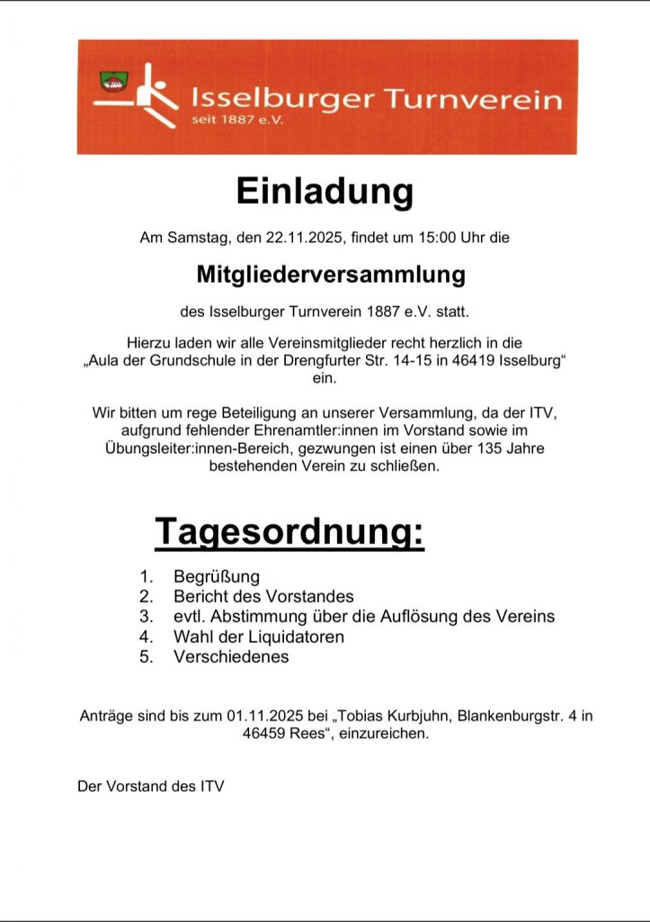 Kontaktaufnahme hier, auf unserer Internetseite „www.itv1887.de“ oder unter 0176/43473212. (ab 18.00 Uhr)